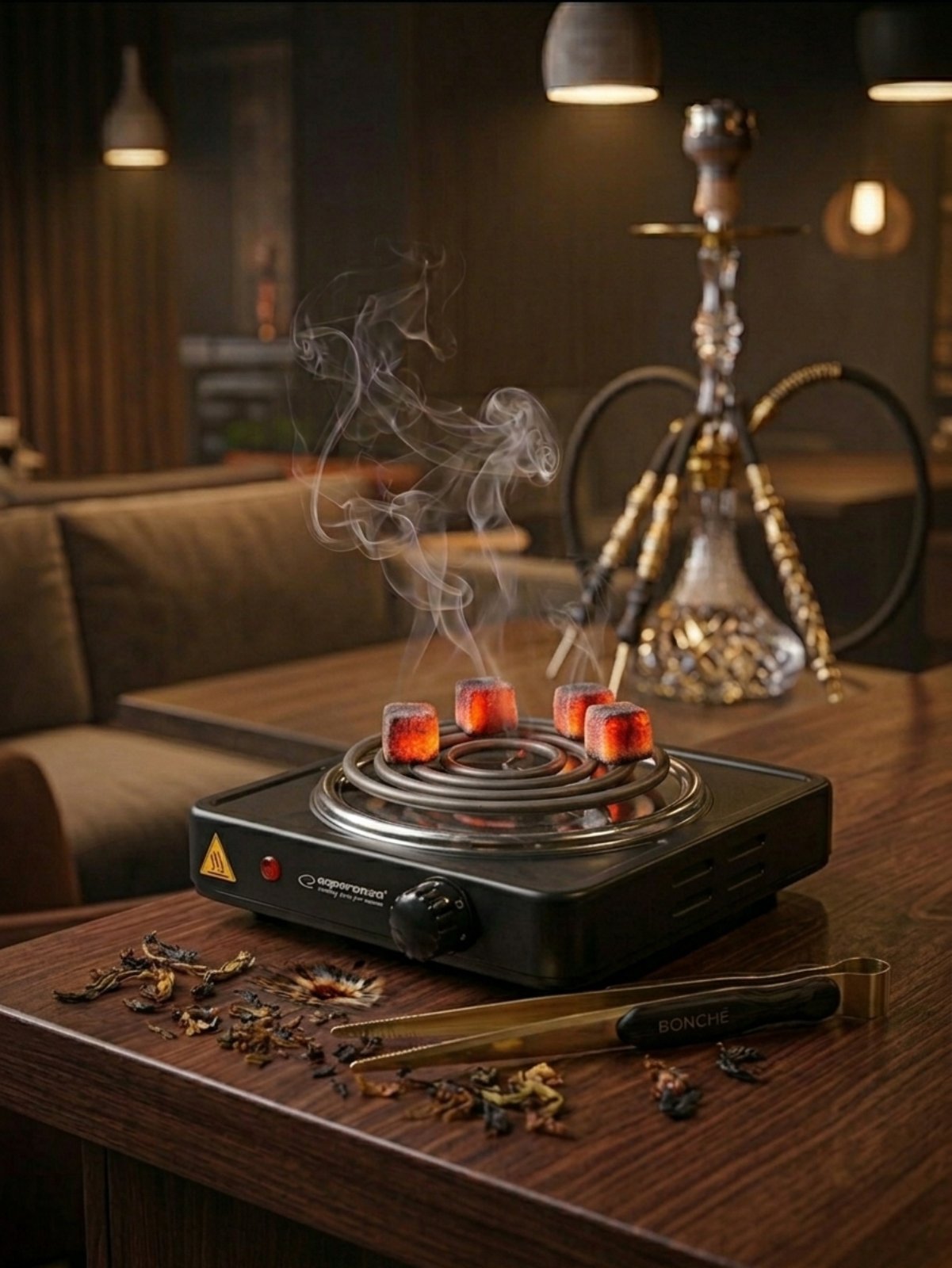 Котлон за въглени 1000W На този котлон спокойно могат да се съберат до 6-8 въглена едновременно, което го прави идеален, ако подготвяш повече от едно наргиле.Тези котлони се нагряват силно. Винаги ги поставяй върху термоустойчива повърхност (като дървената маса на снимката, но внимавай да не докосва корпуса директно, ако е прекалено горещ).