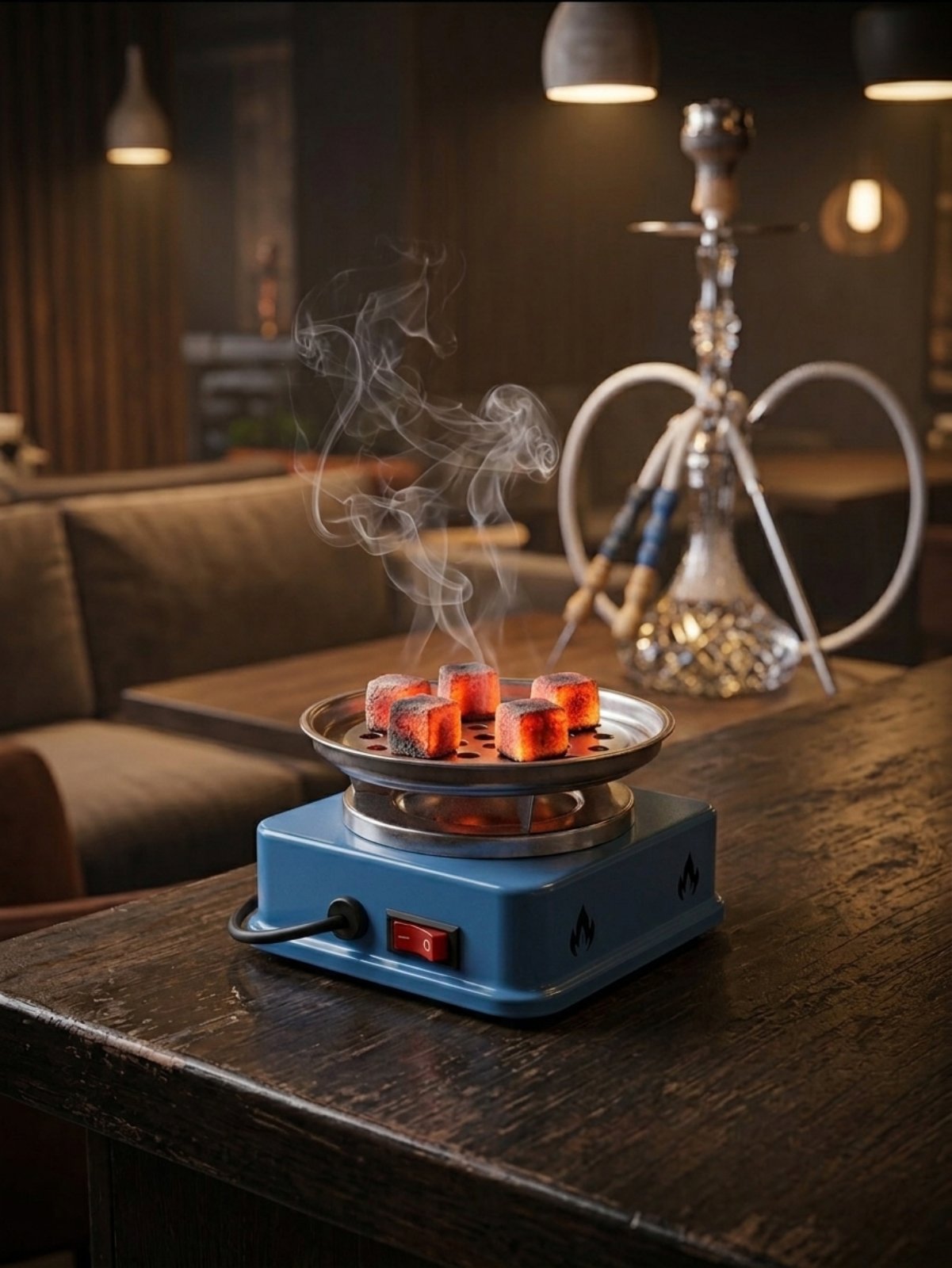 Вместимост: Както е показано, на него лесно се побират 5 или повече въглена (25мм или 26мм), което е идеално за подготовка на две наргилета едновременно. Бутон за включване: Моделът разполага с прост ON/OFF превключвател със светлинна индикация, което го прави много лесен за работа – няма нужда от постоянно регулиране на термостат.Равномерно нагряване: Благодарение на перфорираното дъно, въздухът циркулира по-добре, което помага на въглените да се разпалят равномерно от всички страни.