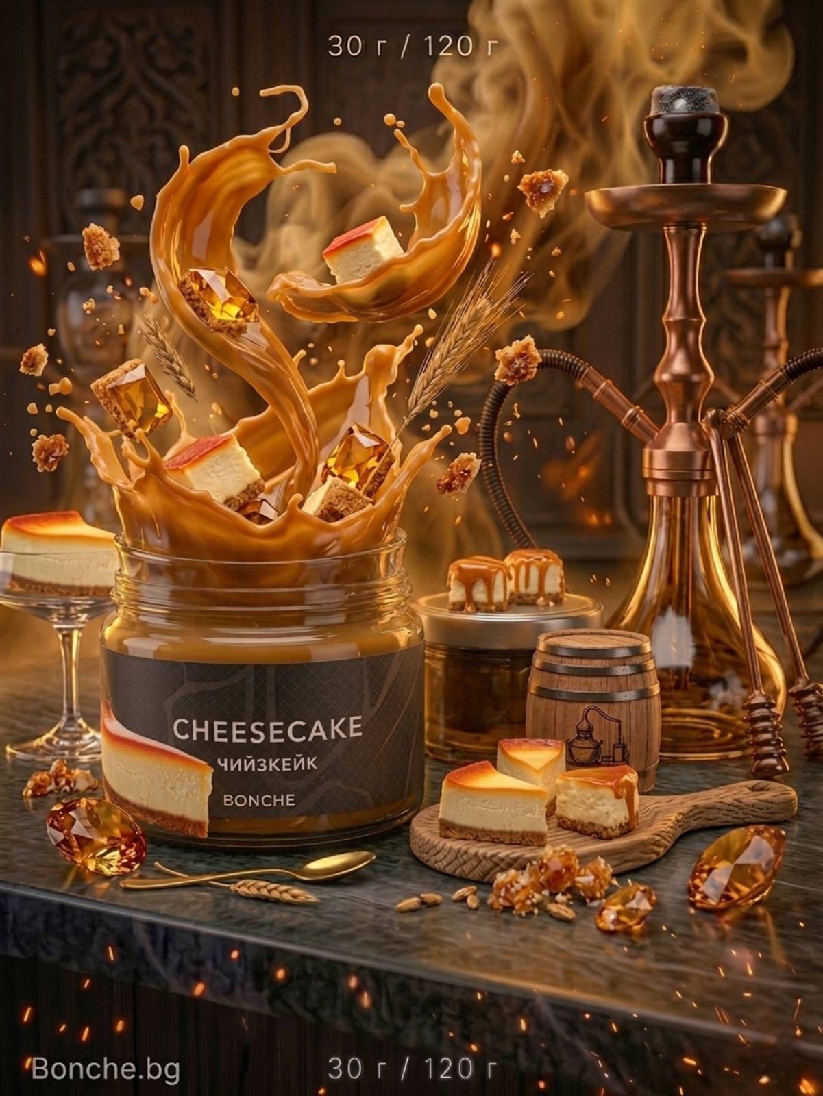 Bonche – Cheesecake -30гр. Bonche – Cheesecake (Чийзкейк) е един от най-добрите десертни аромати на марката. Основната нотка е на плътен, печен чийзкейк. Усеща се специфичният вкус на нежно крема сирене с лека млечна киселинност, която балансира сладостта.В основата на вкуса се долавя аромат на печено тесто и масло – точно като хрупкавата бисквитена основа на истинския десерт.