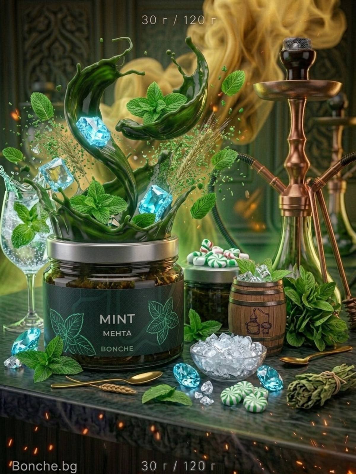 Bonche – Mint -30гр. Вкусът напомня на прясно накъсани листа от мента. Той е „зелен“, леко сладък и много ефирен. Няма го онзи химически привкус на паста за зъби или силни ментолови бонбони.
